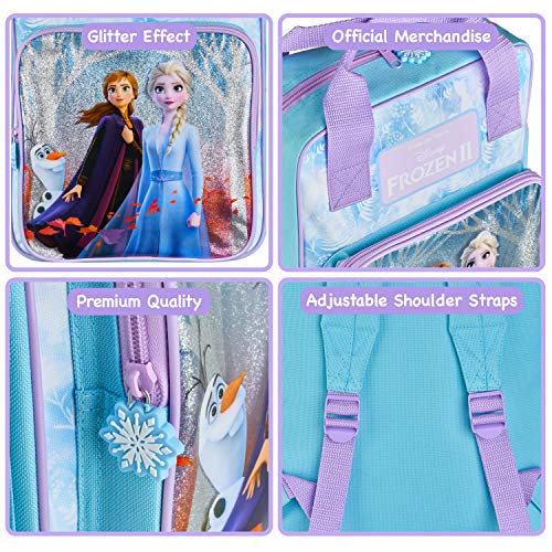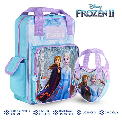 DISNEY FROZEN 2 MOVIE NIEUWE BAG & PURSE – Ruime Frozen 2 Disney Glitter rugzak is geïnspireerd op de Frozen avonturen in Arendelle. Perfect voor school, weekend weg of op reis. Deze prachtige Frozen 2 tas voor meisjes is voorzien van Elsa, Anna, Olaf aan de voorkant holografisch ontwerp, lila riemen, een groot hoofdvak met gewatteerde rug voor comfort, verstelbare gewatteerde riemen, 2 zijzakken en een groot voorvak voor nog meer Frozen speelgoed opslag.