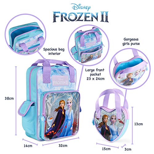 Disney® Officiële Frozen 2 Rugzak voor Meisjes met Elsa & Anna & Bijpassende Meisjes Portemonnee, Frozen voor Meisjes, Schoolreistassen & Meisjes Portemonnee | In de Onbekende Grote Frozen Kids Rugzak, Blauw